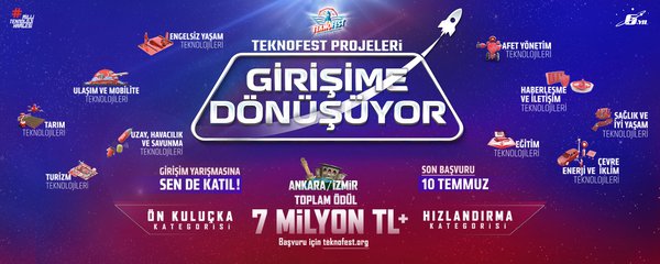 TEKNOFEST’ in 30 Ağustos - 3 Eylül 2023 tarihlerinde Ankara ve 27 Eylül - 1 Ekim 2023 tarihlerinde ise İzmir' de ilk defa gerçekleşecek olan TEKNOFEST Girişim Yarışması' nın başvuruları başlamıştır. Yarışma kapsamında 2018-2023 yılları arasında TEKNOFEST Yarışmalarına başvuru yapan takım üyelerinin projelerini girişime dönüştürmesi, girişime dönüşenlerin büyümesi amaçlanmaktadır.
