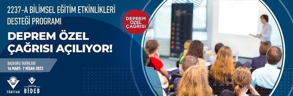 TÜBİTAK Bilim İnsanı Destek Programları Başkanlığı (BİDEB) tarafından 2237-A Bilimsel Eğitim Etkinlikleri Desteği Programı kapsamında “Deprem Özel Çağrısı” açılmıştır. Deprem ile ilgili konularda yüz yüze ya da çevrimiçi bilimsel eğitim etkinliği düzenlemek isteyen akademisyenlerimiz başvurularını, 16 Mart 2023 – 7 Nisan 2023 tarihleri arasında TÜBİTAK’ ın BİDEB Başvuru ve İzleme Sistemi (e-bideb.tubitak.gov.tr) üzerinden yapabilirler.