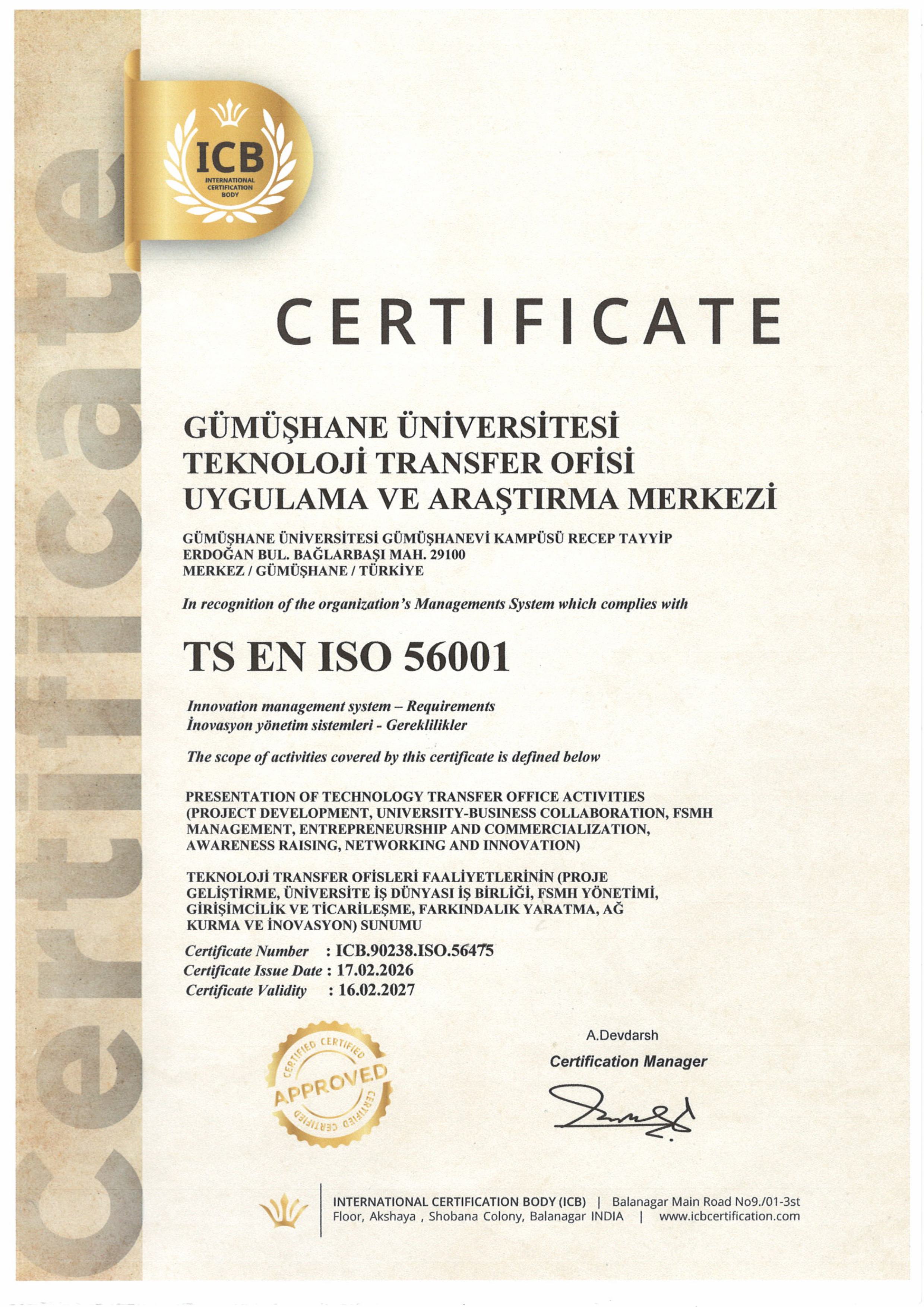 Gümüşhane-TTO, inovasyon odaklı çalışmalarını ulusal ve uluslararası standartlar doğrultusunda sürdürdüğünü belgelendiren TS EN ISO 56001 İnovasyon Yönetim Sistemi Belgesini almaya hak kazanmıştır.